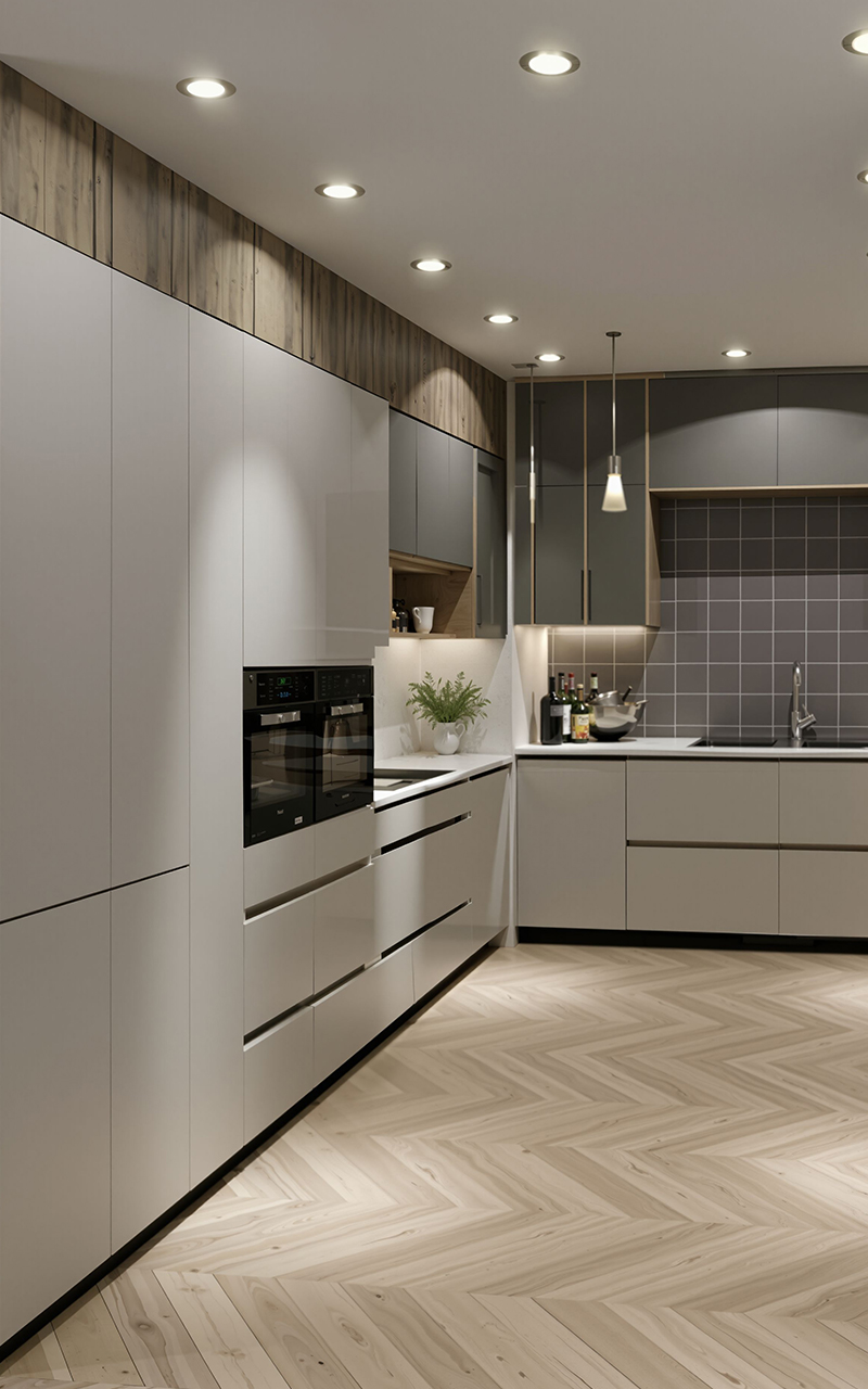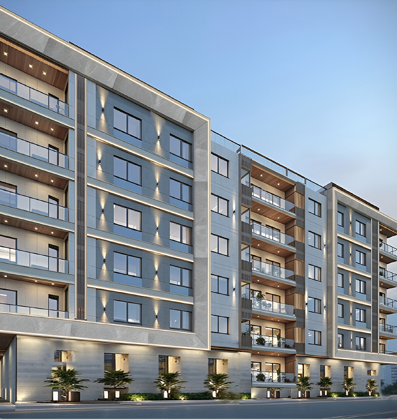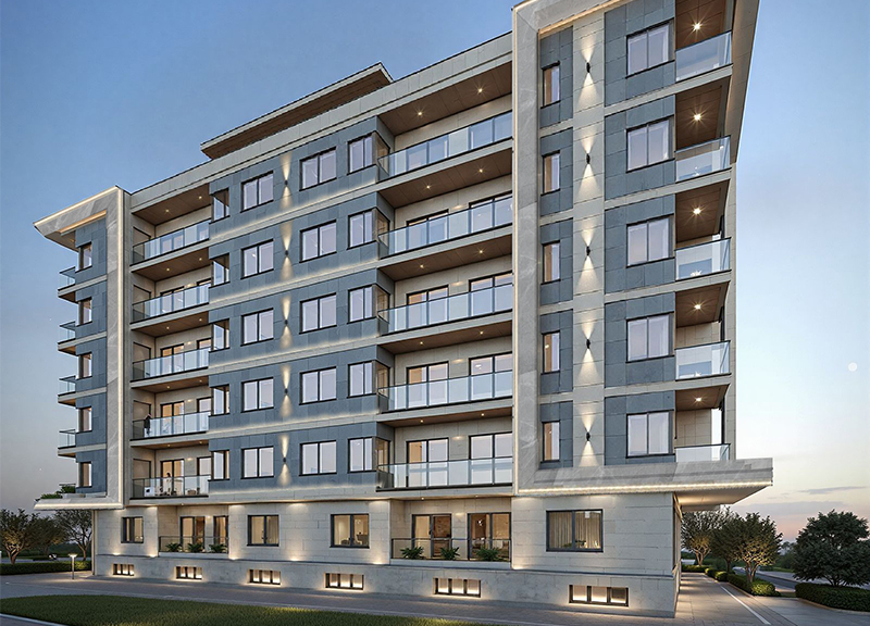 Design Approach: This modern apartment features a clean exterior with stylish balconies and bright, welcoming interiors. The kitchen is sleek and simple, the bedroom feels cozy and calm, and the living room is spacious with elegant ceiling details. Each space is designed for comfort and everyday living, combining beauty with practical design