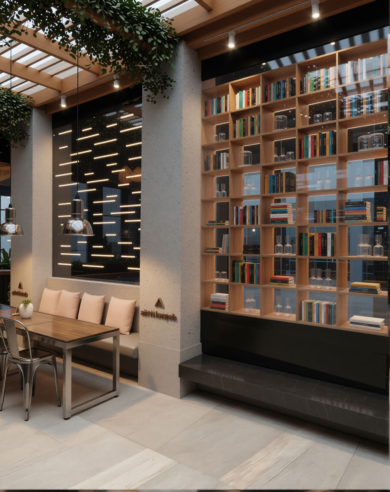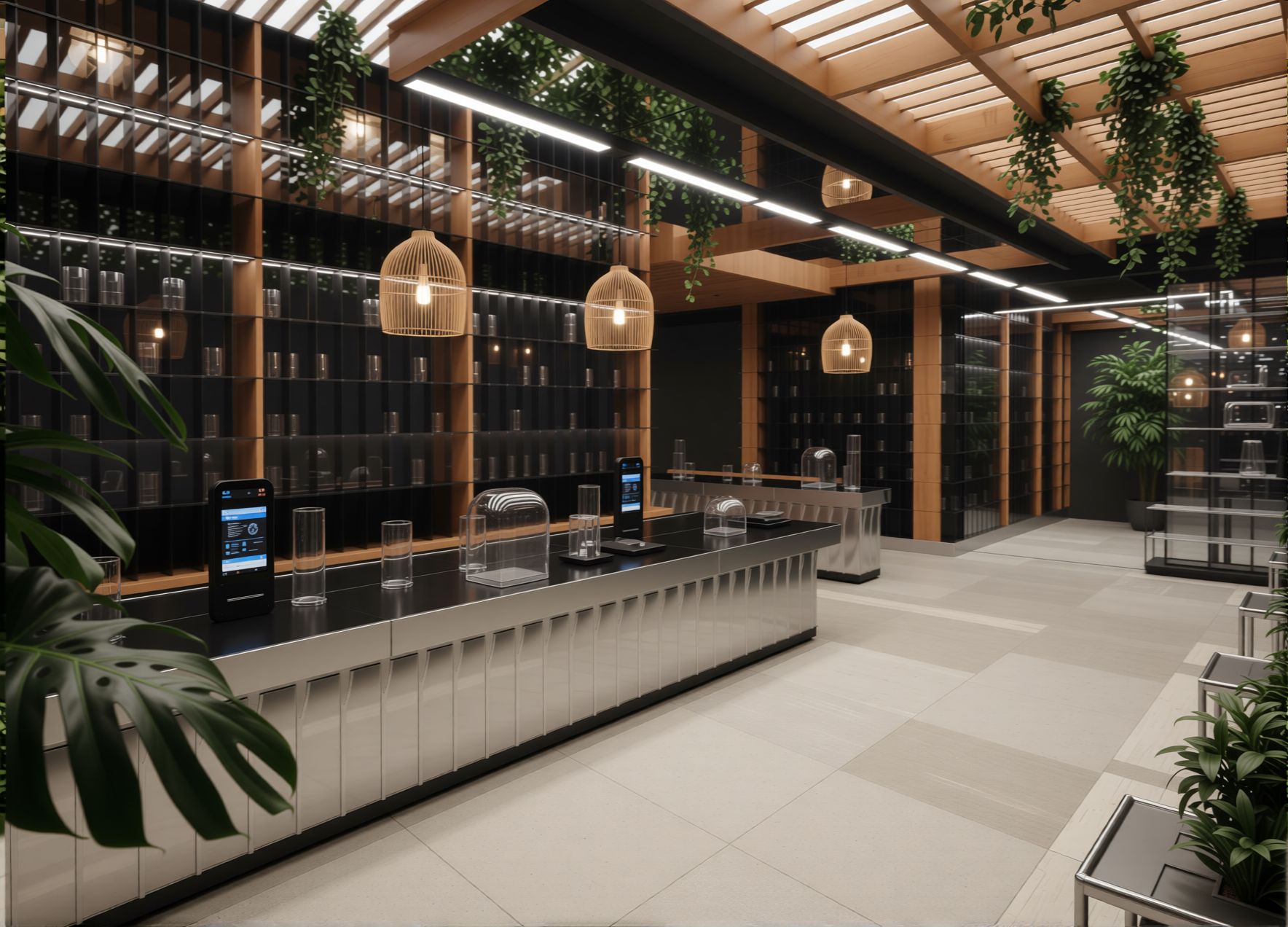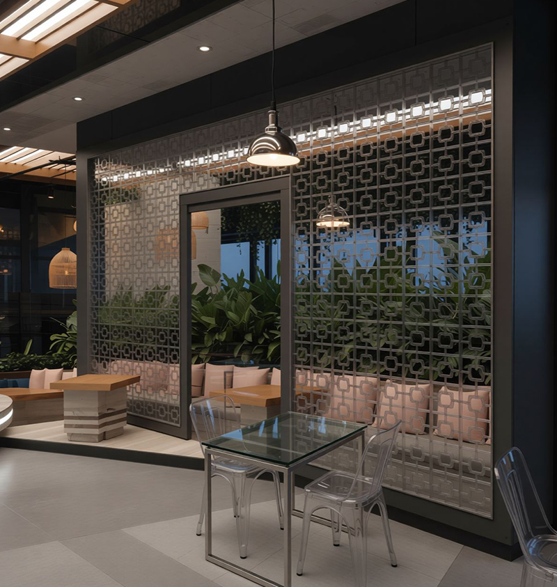 Design Approach: The counter, with its black surface and green-gold patterned front, was modeled as the visual and functional core. Behind it, a geometric shelving wall was developed to balance symmetry with rhythm, using lighting and texture to enhance depth. The green-tiled feature wall was designed to integrate digital screens and shelving, offering both utility and aesthetic cohesion.