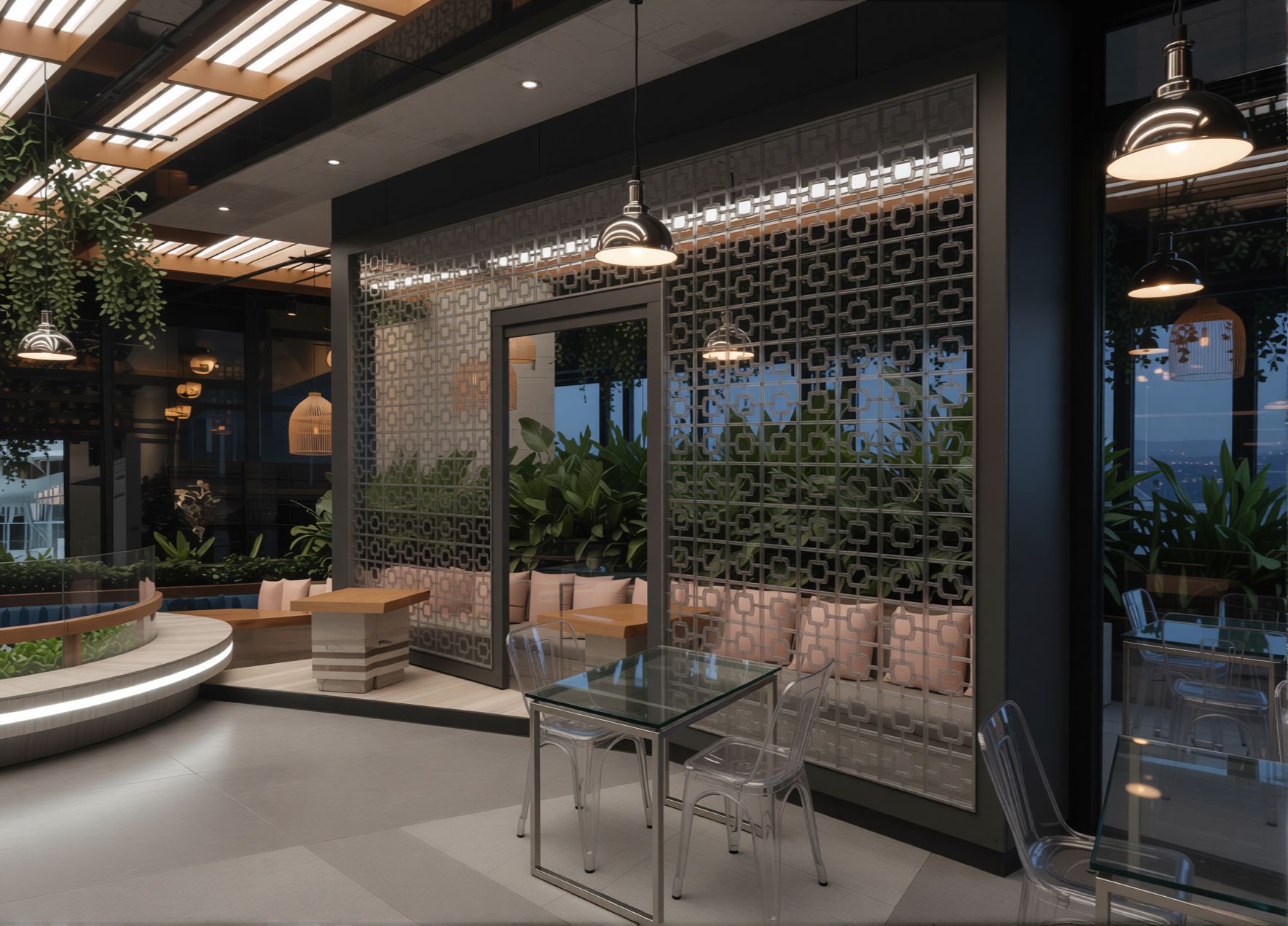 Design Features: Layout includes seating areas, greenery, and walking paths, Selection of plants suited to climate and maintenance needs, Integration of lighting, irrigation, and drainage systems